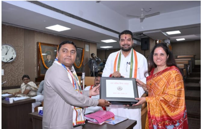 महापौर मीनल चौबे द्वारा सामान्य सभा में नगर निगम बजट पर अभिभाषण प्रस्तुत करने के पूर्व नगर निगम बजट की प्रथम प्रति आसन्दी पर सभापति सूर्यकान्त राठौड़ को नगर निगम वित्त विभाग के अध्यक्ष महेन्द्र खोडियार सहित दी. वित्त विभाग अध्यक्ष महेन्द्र खोडियार ने महापौर मीनल चौबे को बजट की प्रति दी, नेता प्रतिपक्ष आकाश तिवारी और नगर निगम आयुक्त विश्वदीप को महापौर और वित्त विभाग अध्यक्ष ने बजट की प्रति दी.